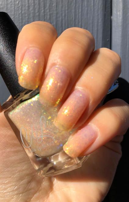 Clear base with UP (red to green to gold shimmer), and yellow to green shifting flake. This is a topper polish and should be worn over a base color. Swatches are shown over What's the Word, Bird? and on it's own. Yellow Polish Lovers Facebook group exclusive.